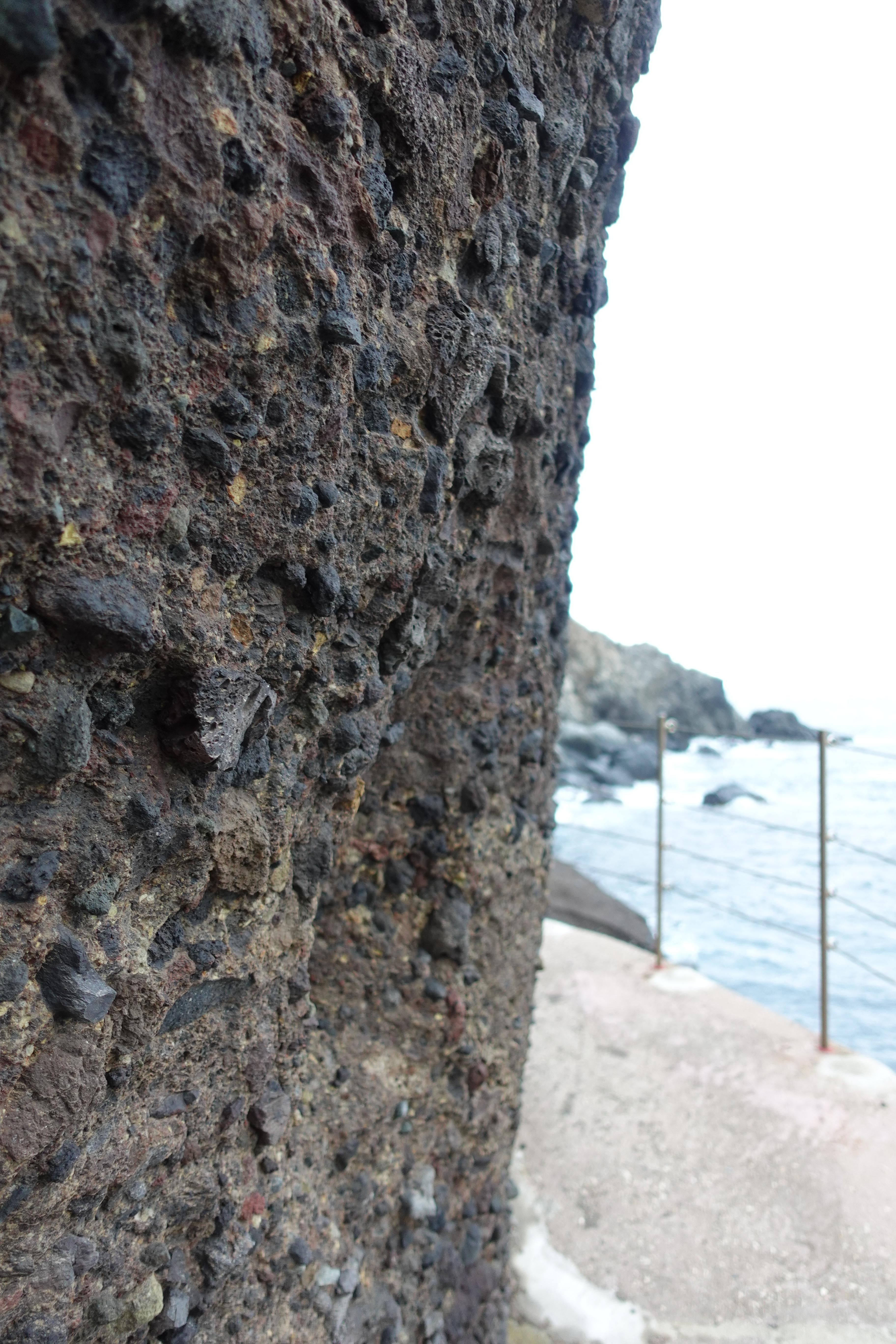 울릉도의 해안 절벽은 알알이 부서지는 듯한 느낌과 강한 바람과 파도에 의해 낙석을 주의해야 한다.
